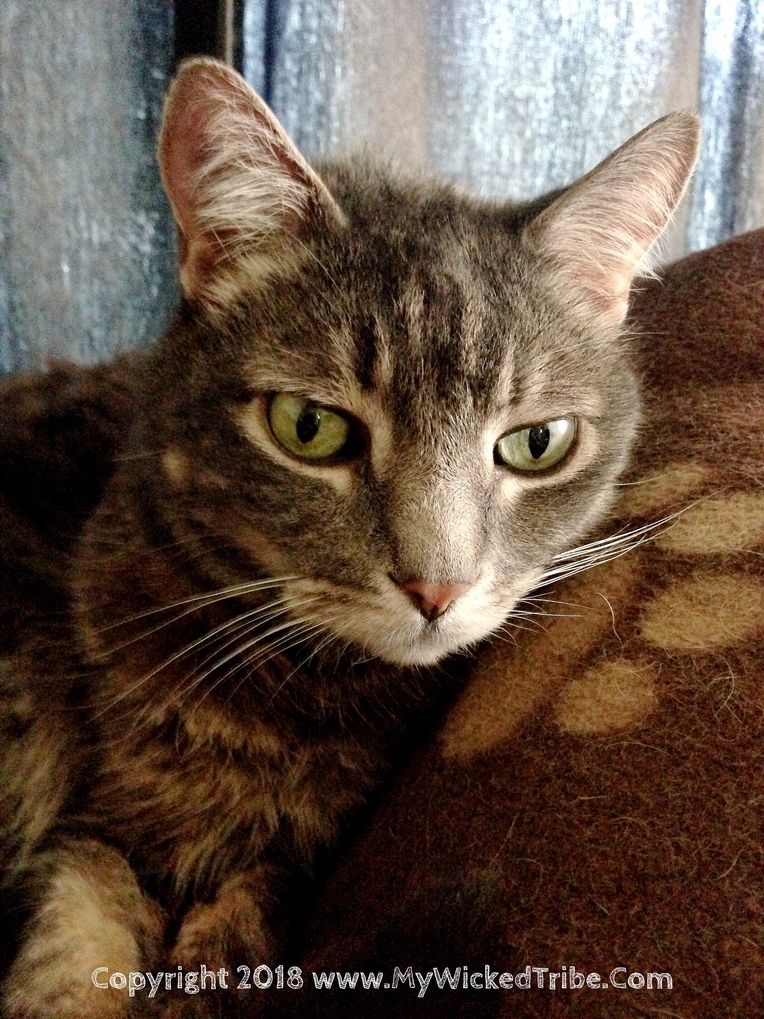 Big beautiful pale green eyes, open very wide, and a strange grey colored fur with paler stripes on the body and face. Short fur. I want this cat.